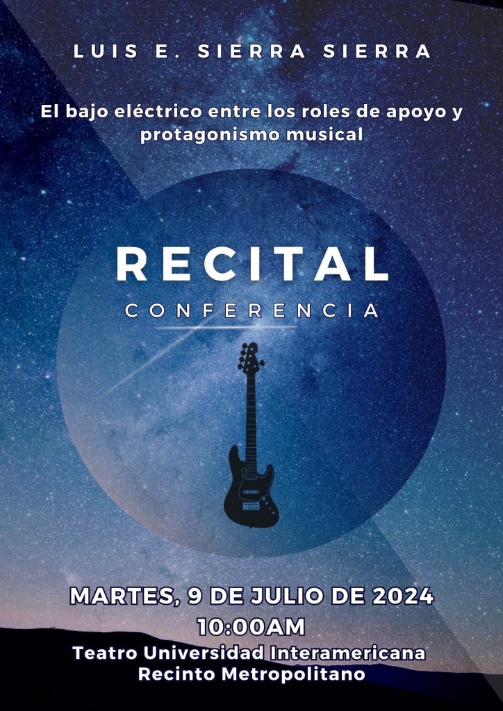 (5 de julio de 2024) – El profesor Luis E. Sierra presentará un Recital-Conferencia en el que ejecutará cinco de las piezas que compuso y forman parte de su proyecto de investigación «El bajo eléctrico entre los roles del apoyo y el protagonismo musical».