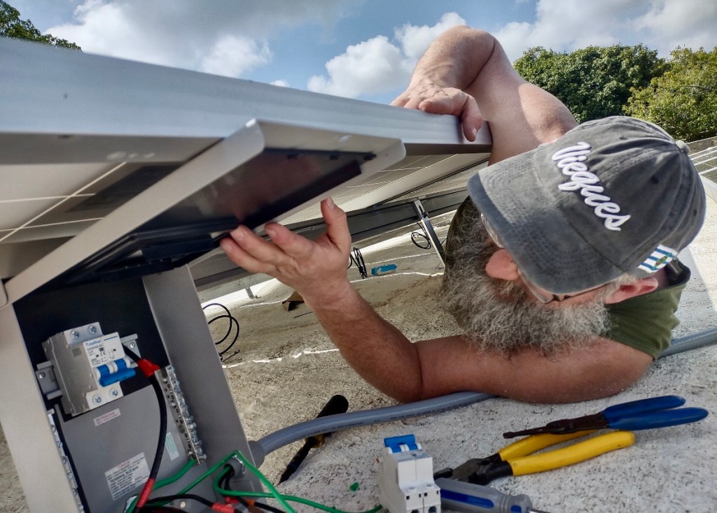 Con la ayuda de todos, el refrigerador estaba frío al final de la tarde, con electricidad de sobra para luces, ventiladores y batidas. No puedo pensar en un mejor ejemplo de la forma en que una pequeña donación aprovecha mi capacidad para ayudar a nuestros compañeros viequenses. Sin fondos puedo ayudar llevando hielo a La Hueca en mi bicicleta. Con un poco de dinero, juntos podemos pasar un día llevando suficiente electricidad solar limpia y silenciosa a La Hueca para que nunca más sea necesario ir a buscar hielo.