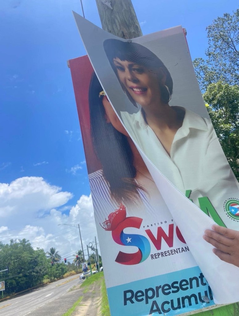 (San Juan, PR- 13 de agosto de 2024) Swanny Enit Vargas Laureano, candidata por acumulación a la Cámara de Representantes por el Partido Popular Democrático (PPD), denunció públicamente un acto de vandalismo de su propaganda electoral en el municipio de Morovis, por parte de la alianza independentista, en especial la campaña de la senadora del PIP, María de Lourdes Santiago.