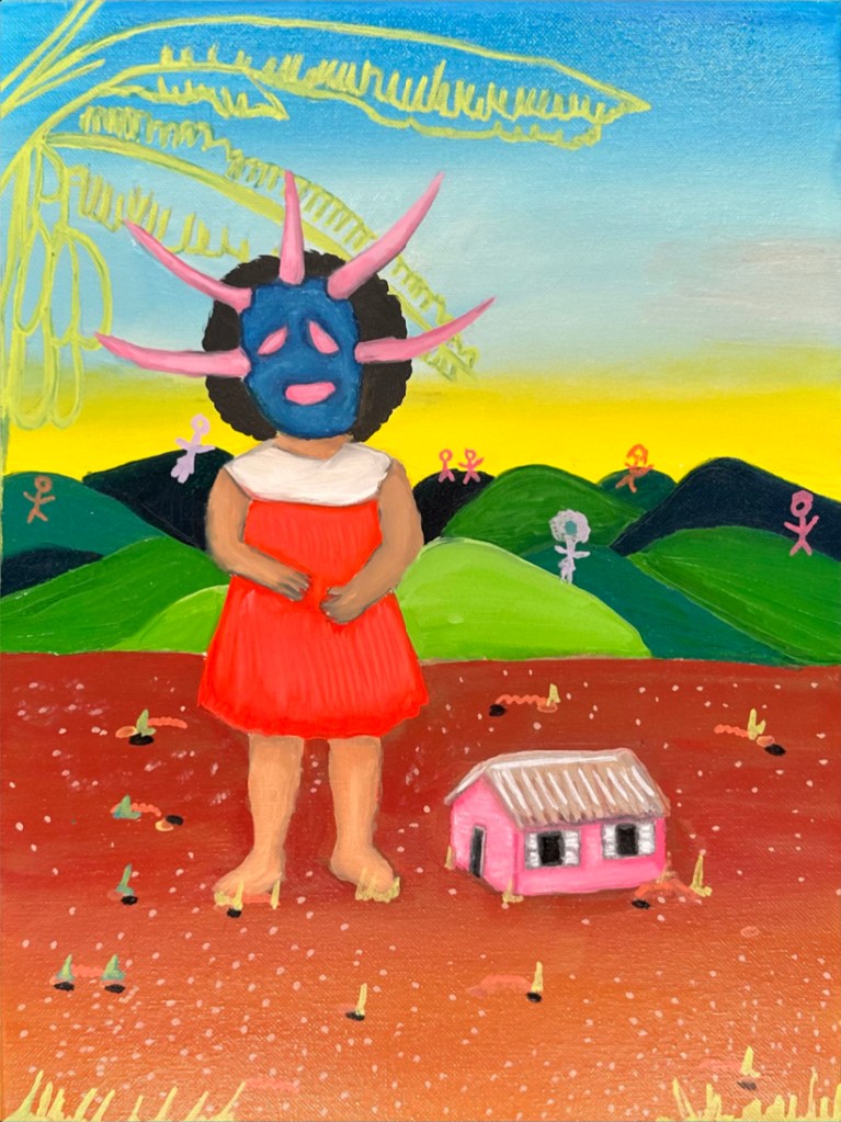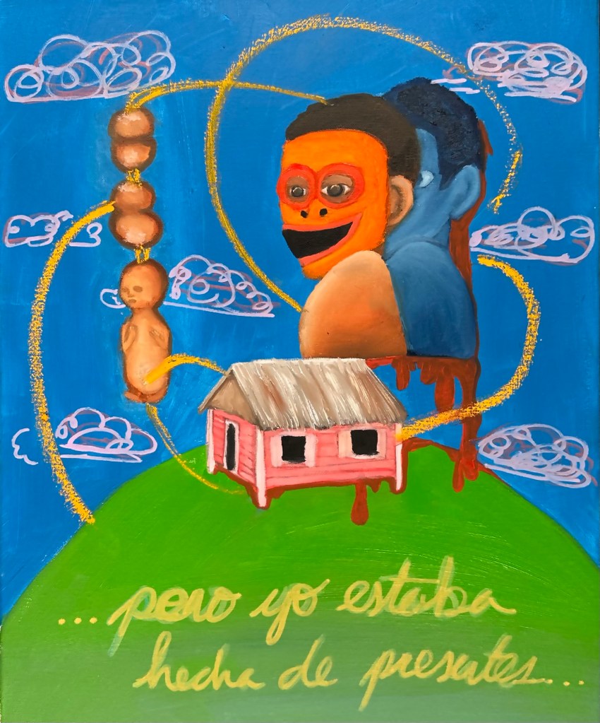 Con relación a su trabajo creativo Estefania señala: “Mi práctica se encuentra con las luchas diarias de anhelar un lugar, llevando emociones pesadas y desafiantes relacionadas con sentimientos de pérdida y desplazamiento. Pienso mucho en las limitaciones que un sistema, una imposición colonial, tiene sobre nosotros para regresar o incluso para estar parcialmente en casa. Pienso mucho en esa niña que tuvo que dejar su hogar, y a través de la pintura le doy un lugar para ser escuchada desde el espacio tanto del colonizado como del colonizador. Llena de profunda tristeza e inmensa rabia, la imaginación de esa niña se visualiza con colores vibrantes, pero con imágenes perturbadoras.”