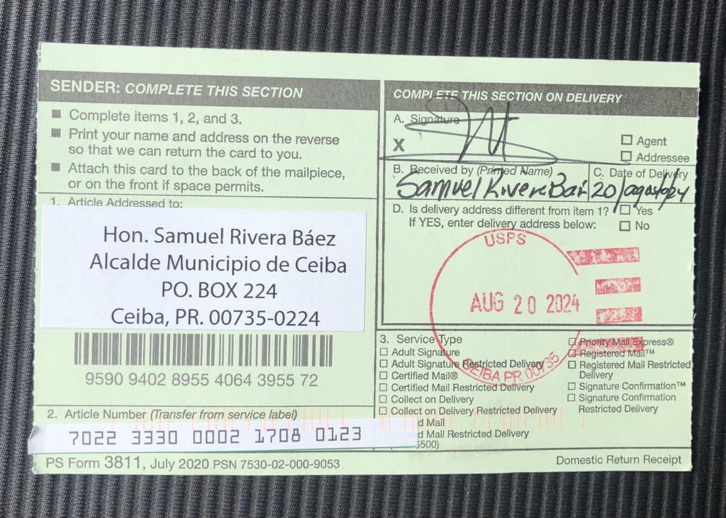 En seguimiento a la noticia que solo ha publicado Prensa Sin Censura, publicamos la carta que la dueña de parte de las tierras donde ubican los portones ilegales, Sra. Marisol Santos Dávila y su asesor legal Rubén Santos cursaron por correo certificado al alcalde Samuel Rivera Báez y que el pasado 20 de agosto él mismo firmó como recibida.