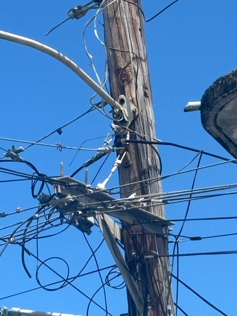(Fajardo) – La infraestructura eléctrica del casco del pueblo de Fajardo está obsoleta. Postes de madera en avanzado deterioro y enjambres de cables que en la próxima tormenta podrían dejar sin luz a los residentes y comerciantes de la Calle del Carmen, donde capturamos la imagen. Al parecer no se puede esperar por LUMA Energy ni por GeneraPR porque hace rato demostraron su incompetencia en el manejo de la red eléctrica de Puerto Rico, incluso en términos de modernización. Pero el alcalde José Aníbal ‘Joey’ Meléndez podría ser proactivo y alertar a las agencias concernidas.
