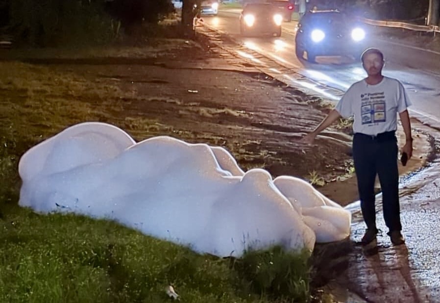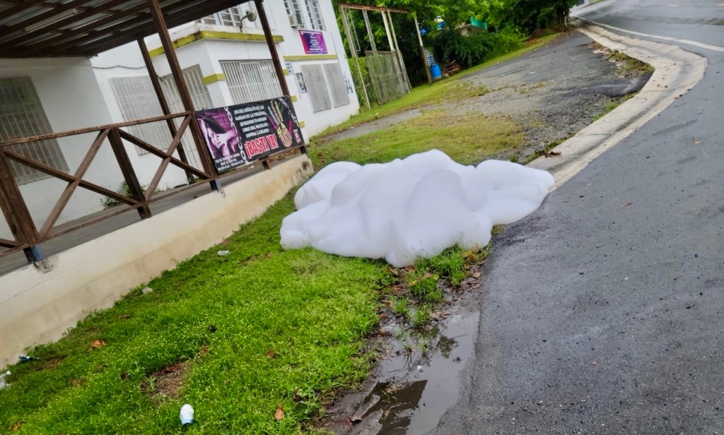 Al atardecer del lunes 9 continúa el espumero que emana de la planta de la compañía Oiltec Ecp Logistics y cubre zonas de la carretera 183, en el kilómetro 5, de Caguas a San Lorenzo y que con la lluvia torrencial de hoy es arrastrado al Río Grande de Loíza que kilómetros más abajo nutre el embalse Carraízo.