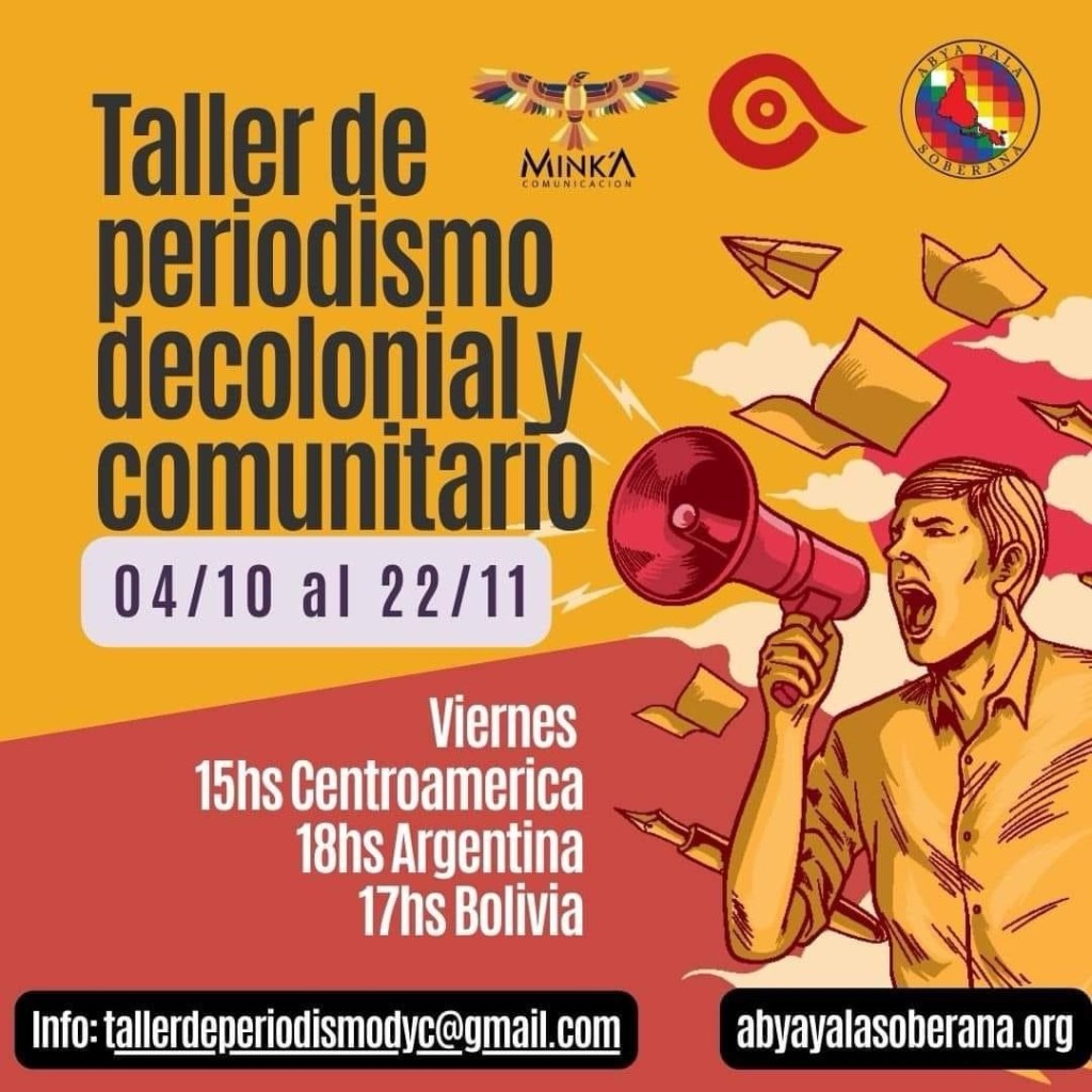 El espacio Abya Yala Soberana, en colaboración con Amapola Periodismo Transgresor y Mink’a Comunicación, invita a participar del Taller de Periodismo Decolonial y Comunitario. Este proceso de formación será gratuito e iniciará el próximo viernes 4 de octubre de forma virtual. Las sesiones se llevarán a cabo a las 16:00 horas (Centroamérica) y 18:00 horas (Argentina).