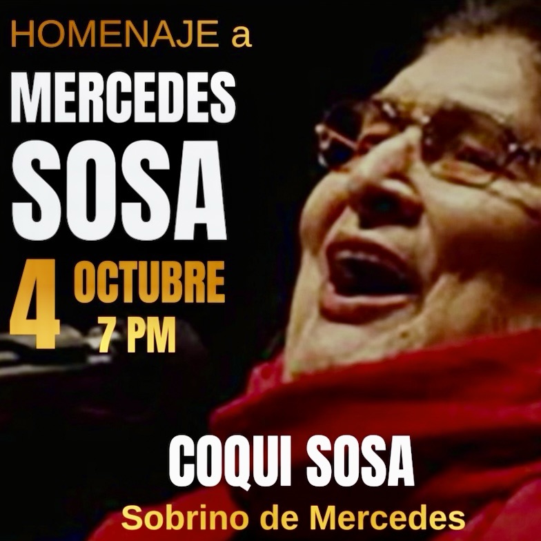 Al cumplirse 15 años de su partida se ofrecerá una charla con canciones cantadas en vivo y contará acerca del libro “Yo no Canto por Cantar: El legado de Mercedes Sosa”, escrito por el músico Coqui Sosa, sobrino de la reconocida cantora de renombre nacional e internacional Mercedes Sosa.