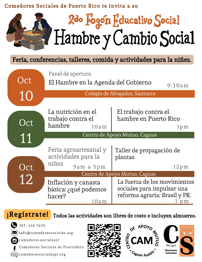 El panel en Colegio de Abogados y Abogadas es la actividad de inicio del 2do Fogón Educativo Social, el evento anual de concientización más importante de Comedores Sociales de Puerto Rico. El Fogón seguirá los días 11 y 12 de octubre, con actividades en el Centro de Apoyo Mutuo de Caguas Pueblo, sede de la organización.