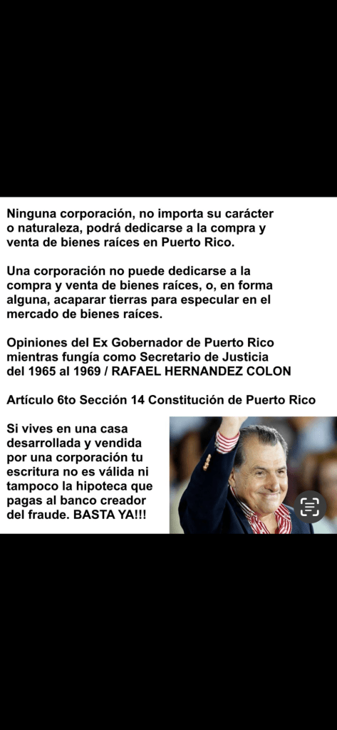 Estas prohibiciones le aplican a cualquier tipo de persona jurídica, se dedique o no a la agricultura en Puerto Rico, según el propio Departamento de Estado, y todos los Gobernadores y ex Secretarios de Justicia de Puerto Rico, comenzando con el fenecido e ilustre ex Gobernador Luis Muñoz Marín y su discípulo, Rafael Hernández Colon desde el año 1940.