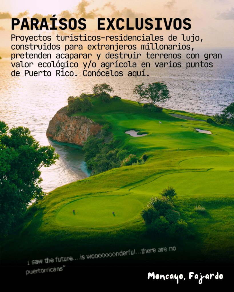 “Nos están dejando sin País. Destruyeron las agencias públicas con despidos y recortes, privatizaron los servicios esenciales, desregularon el proceso de permisos y echaron a la basura el Plan de Uso de Terrenos, engavetaron las recomendaciones para lidiar con el cambio climático y ahora le están dando luz verde hasta con procedimiento expedito y privilegios contributivos a enclaves turísticos exclusivos y excluyentes en terrenos protegidos, así como a la siembra de placas solares en tierras de alto valor agrícola. Proyectos de residencias de $3 o $4 millones y fincas de placas solares que no le sirven a la gente que necesita vivienda, buenos empleos, seguridad alimentaria, un ambiente seguro, un sistema eléctrico confiable y, sí, también espacios naturales saludables y prístinos para la recreación, la educación y para tener algo realmente valioso que ofrecerle al visitante”, explicó Nogales Molinelli, quien destacó y describió varios de los proyectos que se están gestionando actualmente con la aprobación y promoción del gobierno y sin participación pública, tales como los megaproyectos Esencia en Cabo Rojo, Moncayo en Fajardo y Loopland en Roosevelt Roads, así como desarrollos residenciales para millonarios en Punta La Bandera en Luquillo y en Cerro Gordo en Vega Alta.
