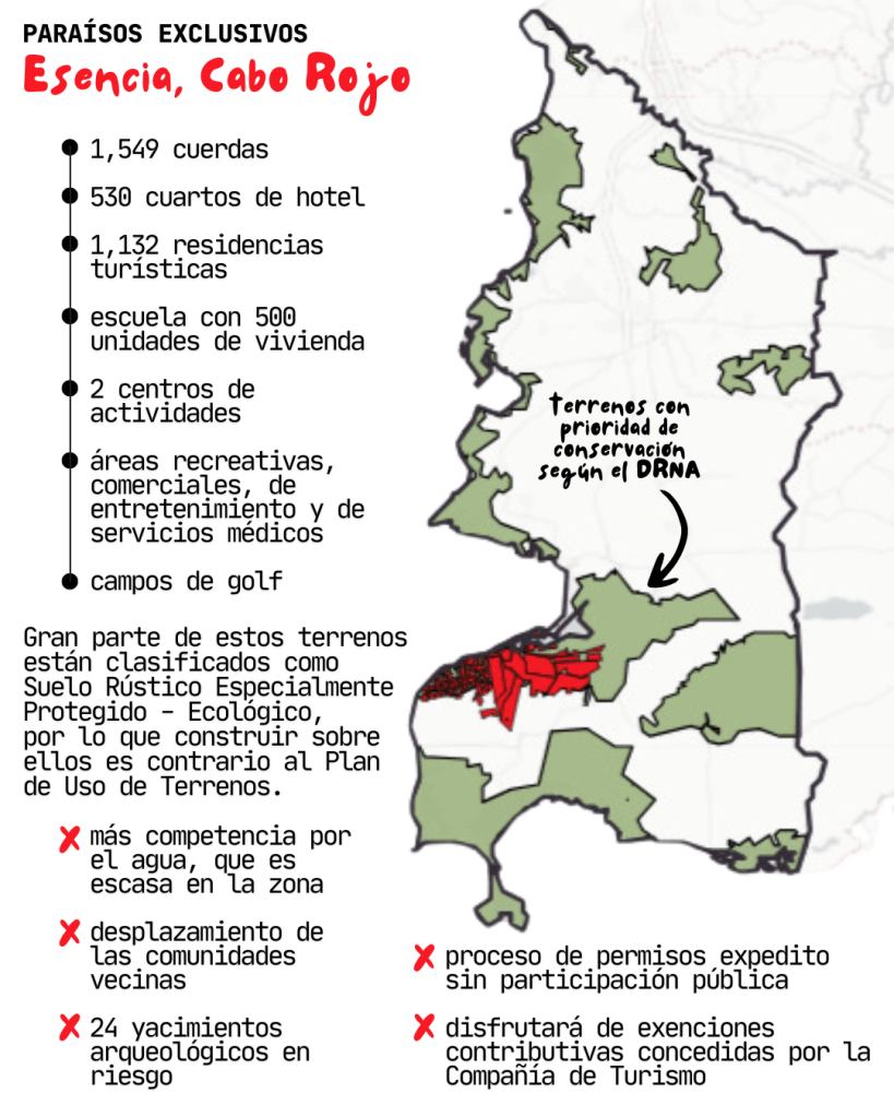 - Esencia, Cabo Rojo – Megaproyecto que ocupará alrededor de 2,000 cuerdas, muchas de terrenos agrícolas, de alto valor ecológico y arqueológico, junto a la bahía de Boquerón, de las cuales ya han adquirido privadamente alrededor de 1,549. Incluirá cuatro hoteles con 530 habitaciones, 1,132 residencias turísticas, una escuela con 500 unidades de vivienda, 2 centros de actividades, áreas comerciales, de entretenimiento y de servicios médicos, y dos campos de golf. El gobierno lo certificó como proyecto prioritario, por lo que se está tramitando mediante un proceso de permisos expedito y en el que no ha habido participación pública. Disfrutará de exenciones contributivas concedidas por la Compañía de Turismo. Entre las consecuencias negativas previstas están la privatización de la costa, mayor competencia por el agua ya escasa en la zona, el desplazamiento por gentrificación de comunidades vecinas y la amenaza a 24 yacimientos arqueológicos.