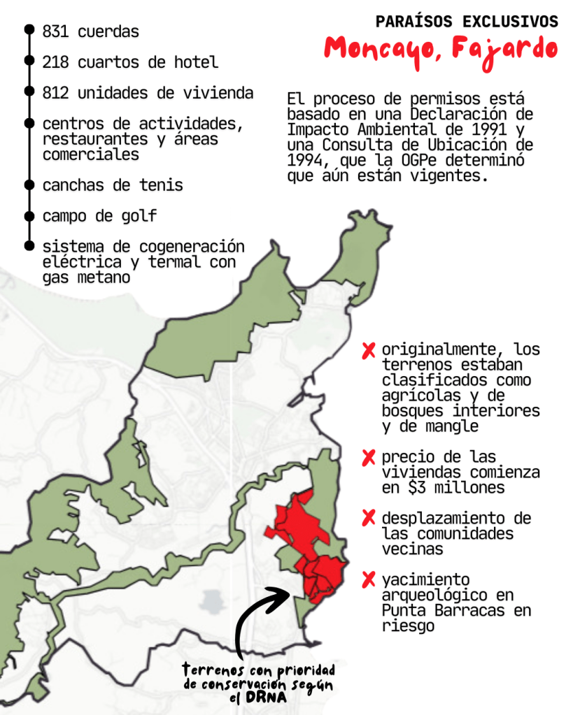 - Moncayo, Fajardo – Megaproyecto de lujo que abarcará 831 cuerdas. Incluye 218 cuartos de hotel, 812 unidades de vivienda que comienzan en $3 millones, centros de actividades, restaurantes y áreas comerciales, canchas de tenis, un campo de golf y un sistema de cogeneración eléctrica y térmica con gas metano. Es un proyecto que fracasó a finales del 1998 y en el que el gobierno de Puerto Rico perdió mucho dinero. El proceso de permisos actual está basado en la Declaración de Impacto Ambiental de 1991 y en una Consulta de Ubicación de 1994 por la cual terrenos originalmente clasificados como agrícolas y bosques interiores y de mangle, ahora son urbanizables. El proyecto está respaldado y facilitado por el gobierno a través de decretos contributivos otorgados bajo el capítulo de Economía del Visitante de la Ley 60. Entre los potenciales efectos negativos están el desplazamiento de las comunidades vecinas, la pérdida de terrenos agrícolas y la amenaza al yacimiento arqueológico en Punta Barracas.