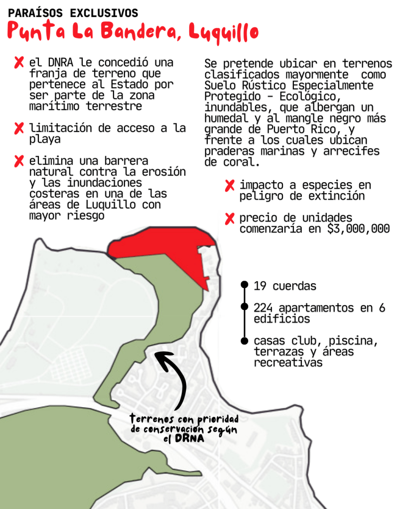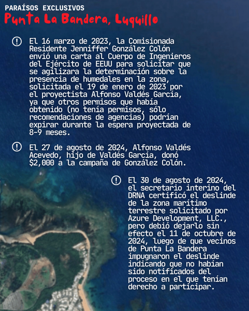 - Azure (Punta La Bandera), Luquillo – Ocupará 19 cuerdas de terrenos que son mayormente bosque de mangle y humedal junto al balneario de Luquillo que actualmente actúa como una barrera natural contra la erosión y las inundaciones costeras en una de las áreas de Luquillo con mayor riesgo de inundaciones. Consta de 224 apartamentos en 6 edificios, casas club, piscina, terrazas y áreas recreativas. Según ha denunciado la organización comunitaria Protege Punta Bandera, el deslinde de la zona marítimo terrestre solicitado para este proyecto fue certificado por el DRNA sin que se hubiese notificado a los vecinos colindantes, razón por la cual se dejó sin efecto luego de su impugnación. Sin embargo, el deslinde tiene otras irregularidades ya que se concedió al proyectista una franja de terreno que pertenece al Estado por ser parte de la zona marítimo terrestre. Se ha señalado que Jenniffer González intervino a favor del desarrollador Alfonso Valdés García ante el Cuerpo de Ingenieros para solicitar que se agilizara el trámite de una determinación sobre la presencia de humedales en el terreno bajo premisas falsas, y que el hijo de Valdés García, Alfonso Valdés Acevedo, donó $2,000 a la campaña de Jenniffer González tres días antes de que se certificara el deslinde.