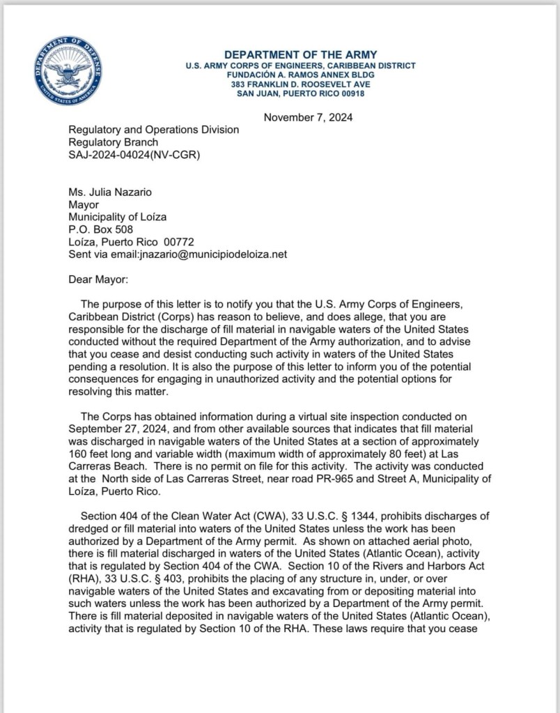 El Coronel del Cuerpo de Ingenieros del Ejército de Estados Unidos, Brandon L. Browman, envió el pasado 7 de noviembre, dos días después de las elecciones, una carta a la alcaldesa de Loíza Julia Nazario Fuentes, reelecta a un tercer término, por la colocación de gaviones en el litoral sin alegadamente los permisos correspondientes.