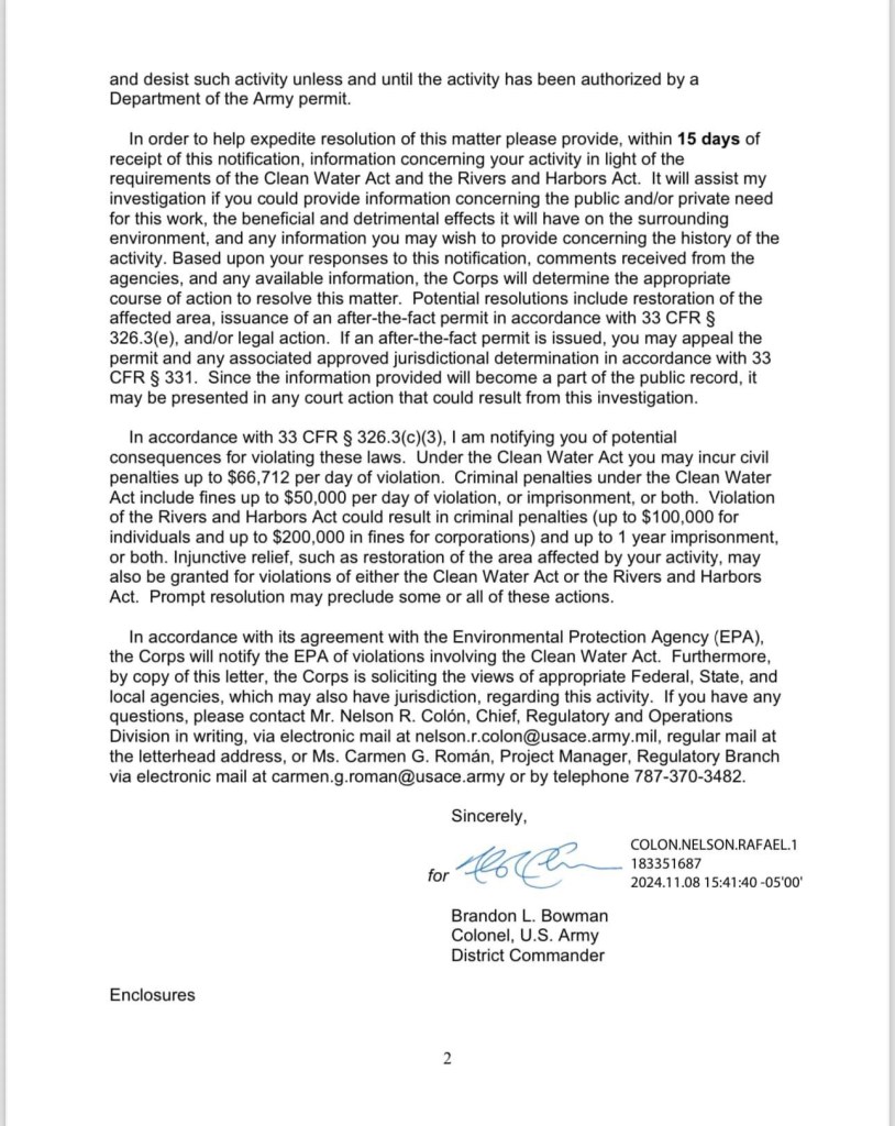 El propósito de esta carta es notificarle que el Cuerpo de Ingenieros del Ejército de los Estados Unidos tiene razones para creer, y alega, que usted es responsable de la descarga de material de relleno en aguas navegables de los Estados Unidos realizada sin la autorización requerida del Departamento del Ejército, y para aconsejarle que cese y desista de realizar dicha actividad en aguas de los Estados Unidos a la espera de una resolución.