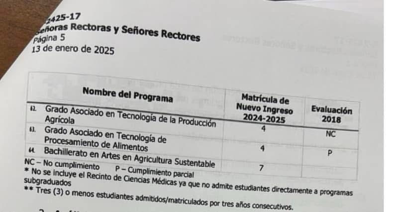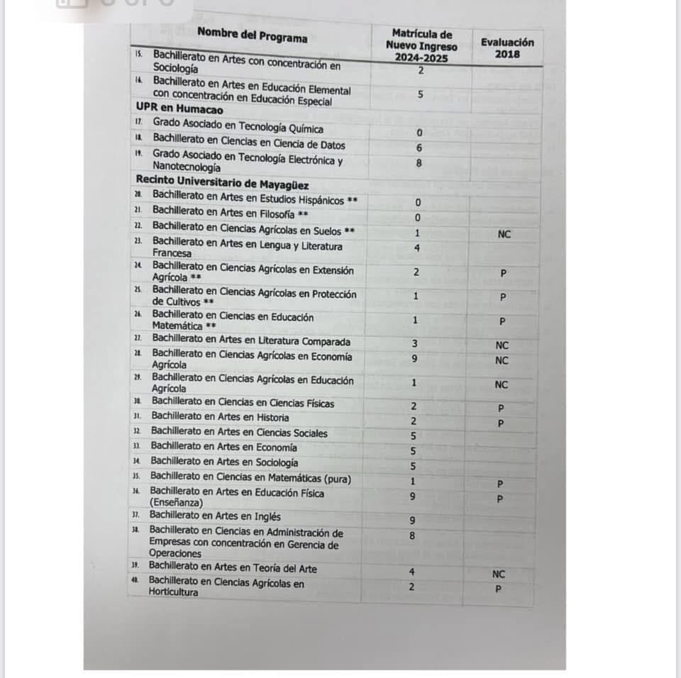 Como parte de esta medida, la Oficina de Admisiones de la Administración Central inhabilitará el programa en la base de datos de forma tal que no se admitan nuevos estudiantes en dichos programas en agosto de 2026. Con esta medida no se emitirán cartas de admisión para estos programas al 31 de enero de 2025, según programado.