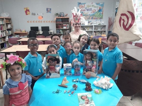 Para reforzar el mensaje y estimular la curiosidad de sus estudiantes, Bayron Ferreira se disfrazó de la Abuela Tala, personaje de la película animada Moana 2 para narrar y dramatizar la película a sus pupilos.