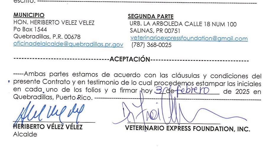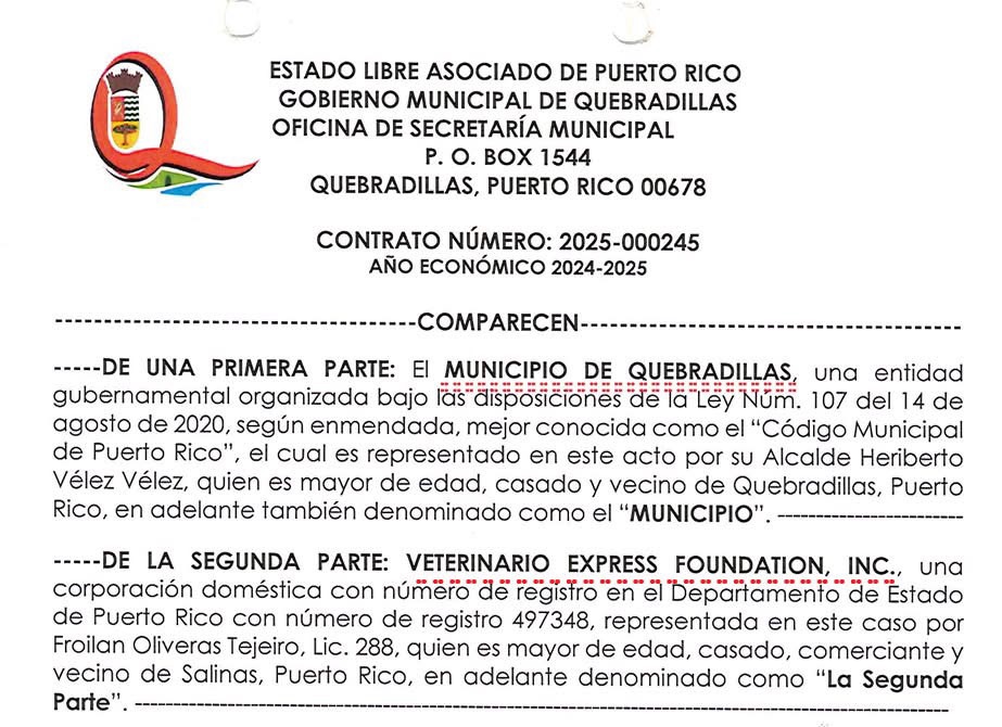 Los Rescatistas PR Trabajando Unidos revelan de un contrato suscrito por el Municipio de Quebradillas y el alcalde Heriberto Vélez Vélez con la compañía 𝐕𝐞𝐭𝐞𝐫𝐢𝐧𝐚𝐫𝐲 𝐄𝐱𝐩𝐫𝐞𝐬𝐬 𝐅𝐨𝐮𝐧𝐝𝐚𝐭𝐢𝐨𝐧 del 𝐯𝐞𝐭𝐞𝐫𝐢𝐧𝐚𝐫𝐢𝐨 𝐅𝐫𝐨𝐢𝐥𝐚𝐧 𝐎𝐥𝐢𝐯𝐞𝐫𝐚𝐬 para el recogido, disposición y desecho de perros y gatos.