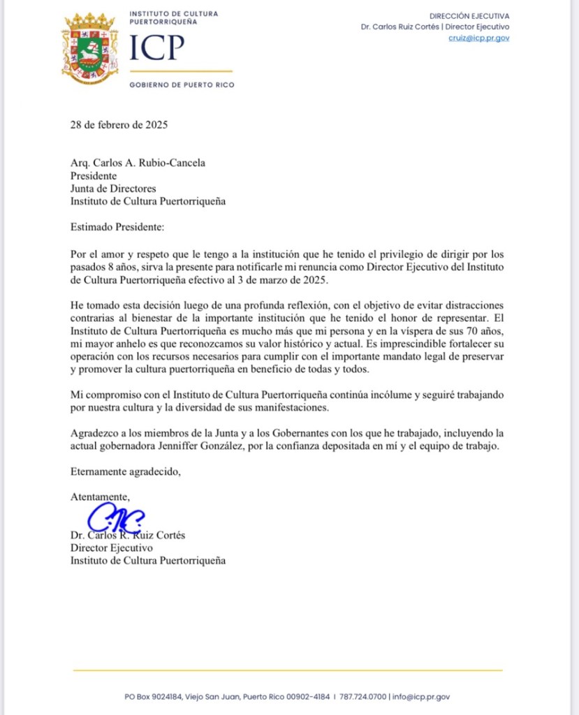 He tomado esta decisión luego de una profunda reflexión, con el objetivo de evitar distracciones contrarias al bienestar de la importante institución que he tenido el honor de representar. El Instituto de Cultura Puertorriqueña es mucho más que mi persona y en la víspera de sus 70 años,