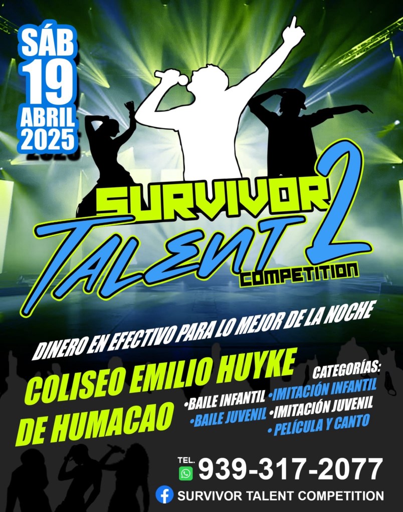 (Humacao, Puerto Rico, 1 de abril de 2025)–El productor Jorge E. Collazo Ortiz anunció que comenzaron las inscripciones para la competencia de talento denominada, “Survivor Talent Competition 2”, que se llevará a cabo, el sábado 19 de abril, desde las 5:00 de la tarde, en el Coliseo Emilio E. Huyke de Humacao.