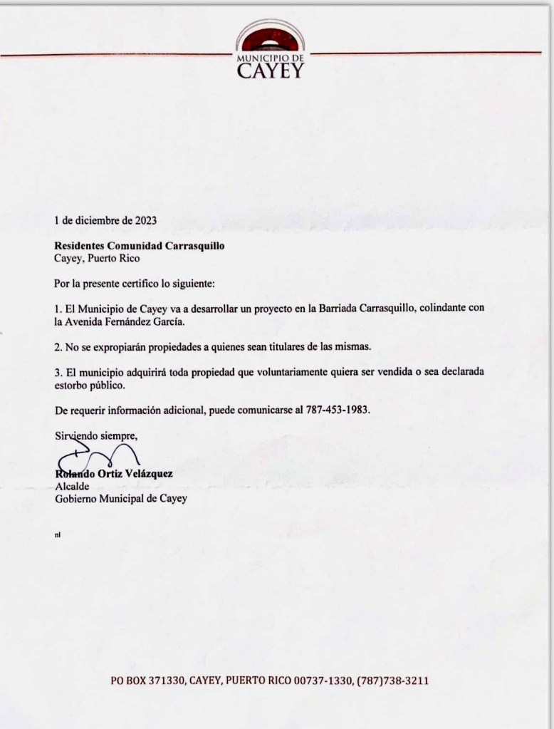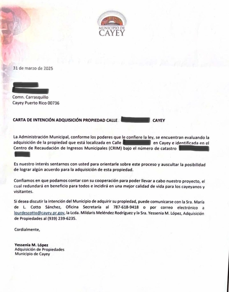 Sin embargo, tan reciente como el pasado 31 de marzo del 2025, algunos residentes de la comunidad recibieron una carta de “intención de adquisición de propiedad”. La carta establece “según los poderes que le confiere la ley”, sin especificar las leyes aplicables, que el municipio ha evaluado la adquisición de esa propiedad. Incluye una invitación a los dueños afectados para “orientarlos sobre el proceso” de compra de la propiedad. También piden la “cooperación para poder llevar a cabo nuestro proyecto, el cual redundará en beneficio para todos e incidirá en una mejor calidad de vida para los cayeyanos y visitantes”. La carta fue enviada por Yessenia M. López, de la oficina de Adquisición de Propiedades del Municipio de Cayey.