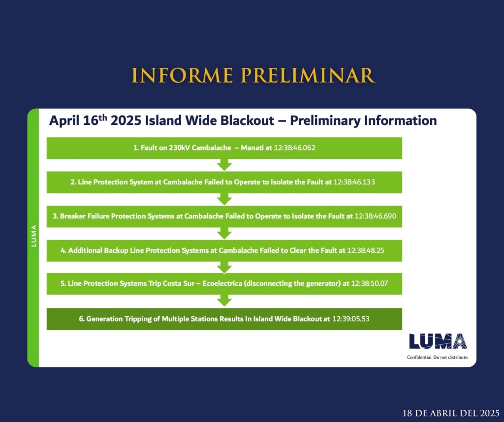 (San Juan, Puerto Rico, 18 de abril de 2025)– El Zar de Energía del Gobierno, el ingeniero Josué Colón, presentó ante el pueblo el resumen del informe preliminar del operador privado de la red de transmisión y distribución eléctrica, LUMA Energy, LLC., sobre la falla ocurrida en el servicio eléctrico el pasado miércoles cerca de las 12:38 p.m, la cual dejó a todo Puerto Rico sin electricidad.
