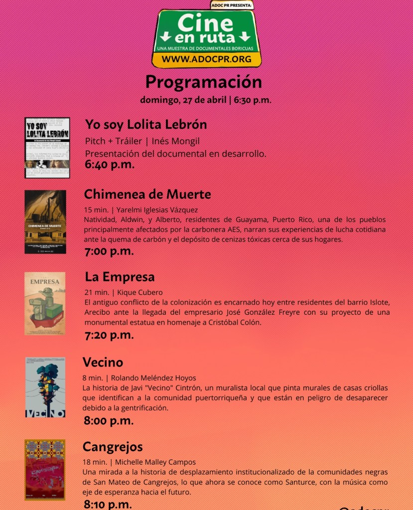 Desde las 6:30 p.m., presentamos una programación cinematográfica única, que refleja las luchas, historias y realidades de Puerto Rico a través de cortometrajes impactantes y profundamente humanos.