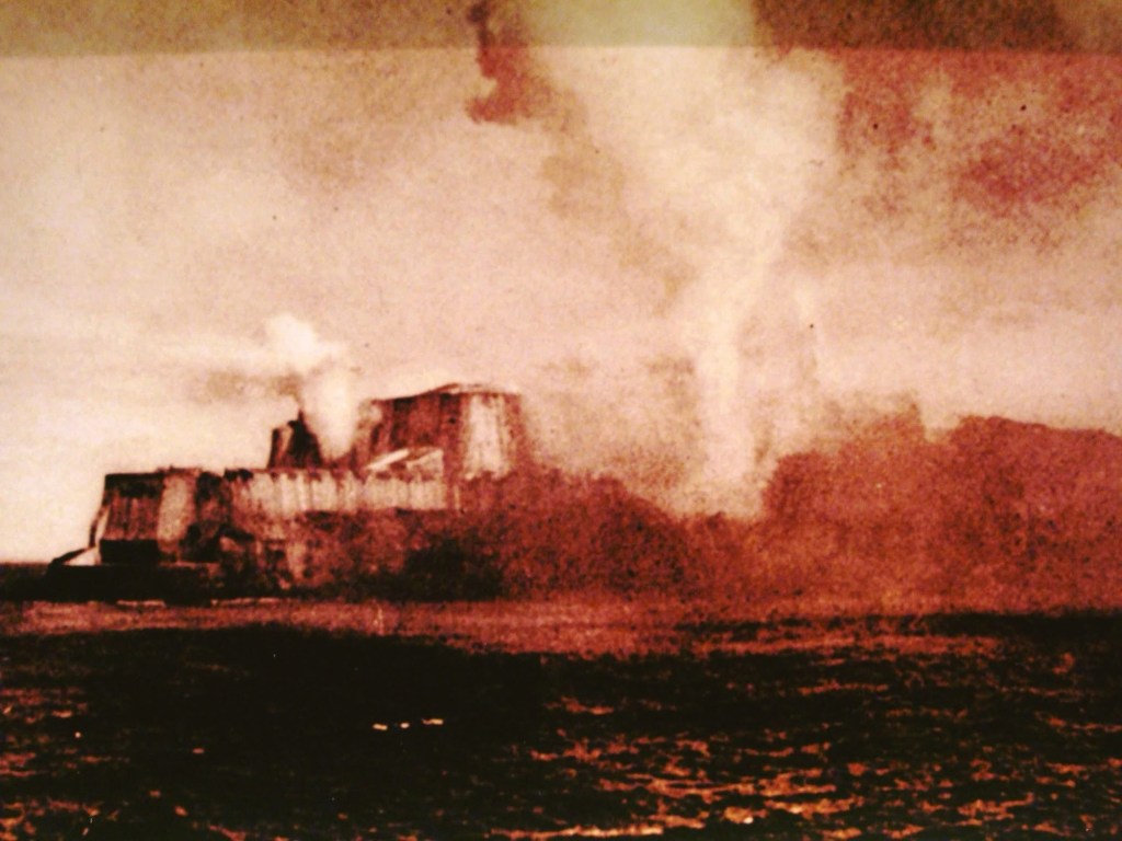 La foto original capta las bombas estadounidenses explotando sobre el Castillo del Morro el 12 de mayo de 1898, un día tal como hoy.