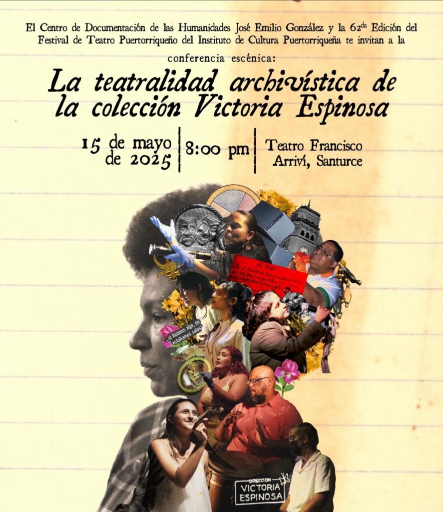 Este trabajo combinado se presentará hoy jueves 15 de mayo en el Teatro Francisco Arriví en Santurce 8:00 p.m. La teatralidad archivística de la colección Victoria Espinosa es un ejercicio de memoria que utiliza el diálogo entre los archivos y documentos históricos de la Colección de Victoria Espinosa. La propuesta híbrida presenta siete ponencias investigativas de seis estudiantes archiveros y un bibliotecario que trabajaron la Colección de Victoria Espinosa custodiada en el Centro de Documentación de las Humanidades José Emilio González de la UPR, Recinto de Río Piedras. Entre los temas que se exponen está el activismo de Vicky y el trabajo artístico de su familia.