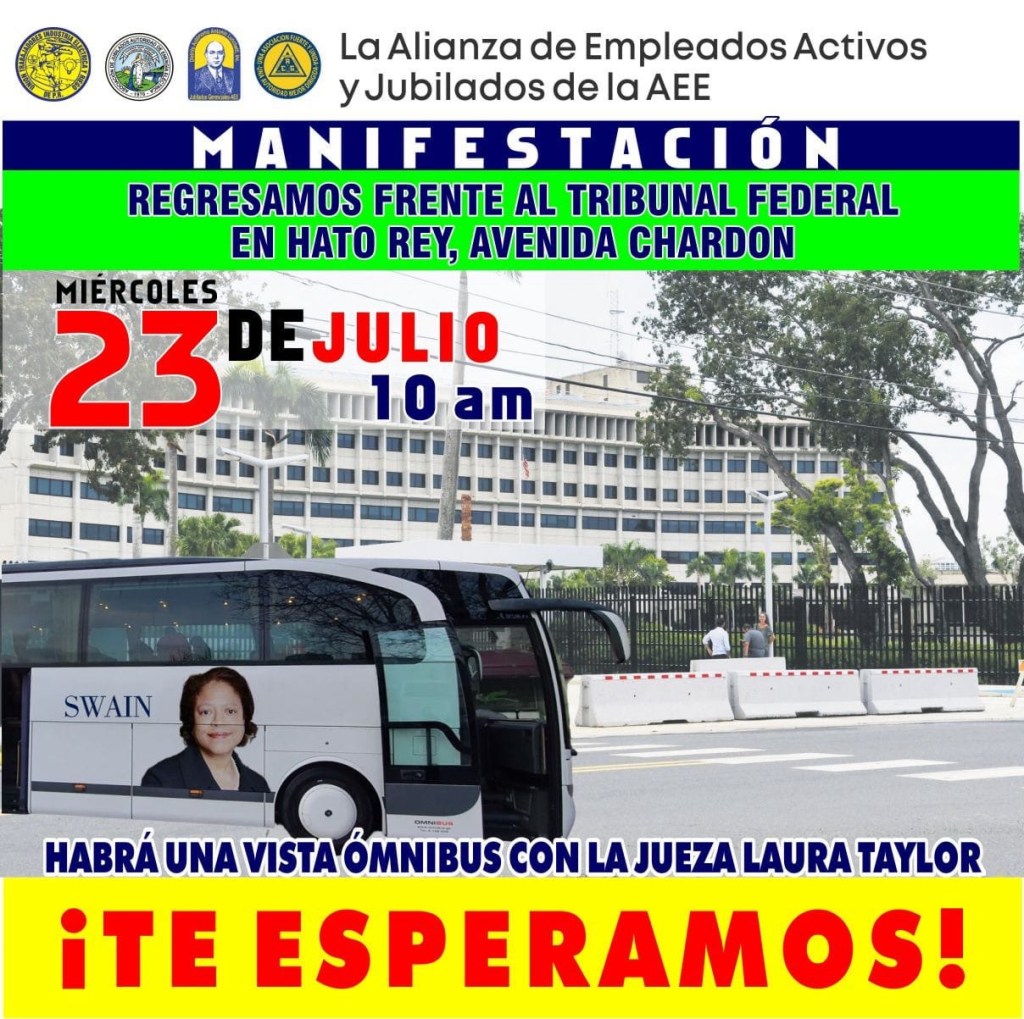 (Martes 22 de julio de 2025) – La Alianza de Empleados Activos y Jubilados de la Autoridad de Energía Eléctrica (AEE) convoca a los medios para la manifestación durante la vista ómnibus citada por la jueza Laura Taylor Swain para atender el plan de ajuste de la deuda de la Autoridad de Energía Eléctrica (AEE).