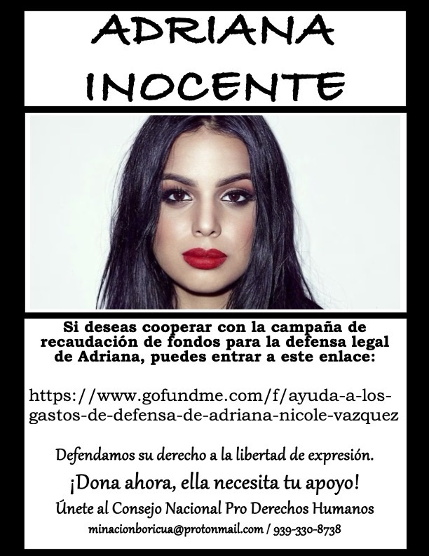 Proseguimos con la campaña de recaudación de fondos para cubrir los gastos de la defensa legal de Adriana Nicole Vázquez. En estos momentos el licenciado Manuel Moraza tiene que someter una apelación al Tribunal Supremo porque el Tribunal Apelativo falló en contra de la determinación que había hecho la jueza superior, en la que decidió que la defensa tenía derecho a examinar las declaraciones juradas con las que el tribunal de primera instancia determinó causa probable contra Adriana por haberle gritado a la “goberladrona” el día de su toma de posesión.