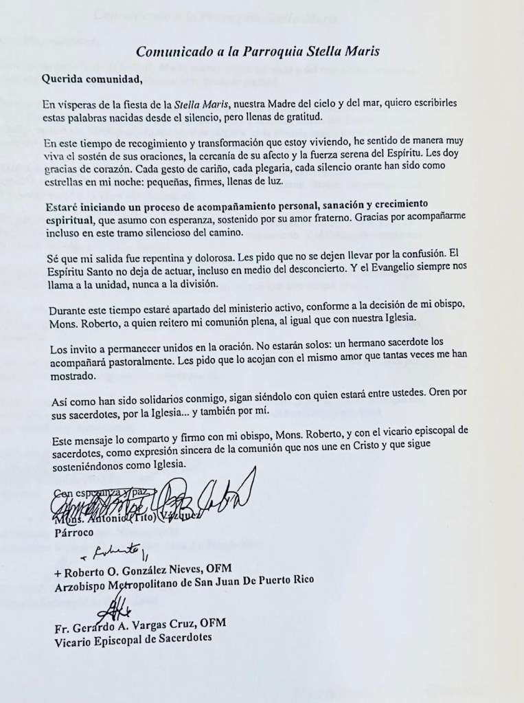 Fue César Santos quien informó al arzobispo Roberto González Nieves mediante una carta sobre la condición de Padre Tito que inexplicablemente se publicó en las redes, comprometiéndose la dignidad e integridad del párroco.