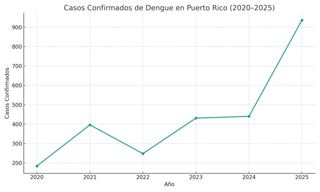 Según datos oficiales del Departamento de Salud y los Centros para el Control y la Prevención de Enfermedades (CDC), hasta principios de agosto de este año se han confirmado 936 casos de dengue, lo que representa un incremento del 113 % en comparación con el mismo periodo en 2024.