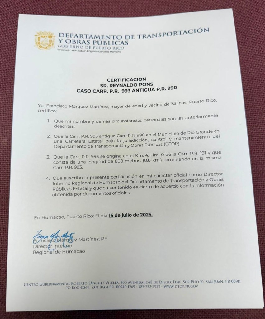 El primero de los documentos, con fecha del 16 de julio de 2025, fue firmado por Francisco Márquez, Director Regional del Departamento de Transportación y Obras Públicas (DTOP) en Humacao. En este, Márquez certifica que la PR-993 tiene una extensión de 800 metros y se extiende hasta el río Mameyes, bajo la plena jurisdicción del DTOP. Esta certificación se basa, según indicó, en documentos oficiales existentes dentro de la propia agencia.