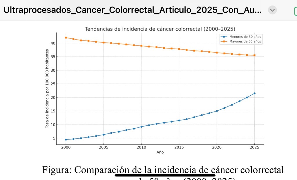 Diversos estudios señalan que la dieta occidental —rica en alimentos ultraprocesados— es uno de los factores que contribuyen a esta tendencia. En EE.UU., hombres que consumen mayores cantidades de alimentos ultraprocesados tienen un 29 % más de riesgo de cáncer colorrectal respecto a quienes consumen menos. Además, los UPFs interactúan con mecanismos biológicos que favorecen la inflamación crónica y alteran la microbiota, facilitando el crecimiento tumoral.