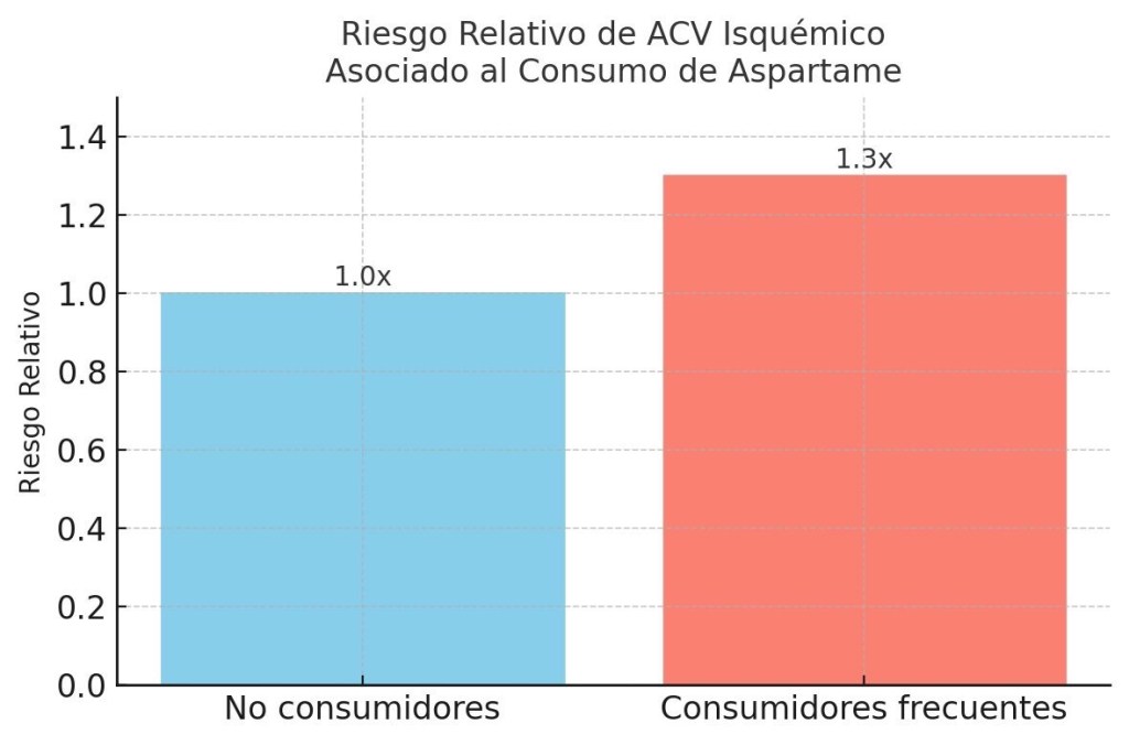 Figura 1. Comparación del riesgo relativo de ACV isquémico entre no consumidores y consumidores frecuentes de aspartame (datos ilustrativos).