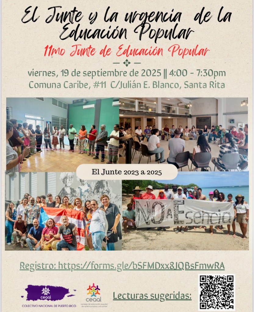 La catedrática universitaria, Dra. Liliana Cotto Morales invita al undécimo Junte de Educación Popular, a celebrarse el viernes 19 de septiembre de 4 a 7:30pm en la sede de Comuna Caribe en Santa Rita, Río Piedras.