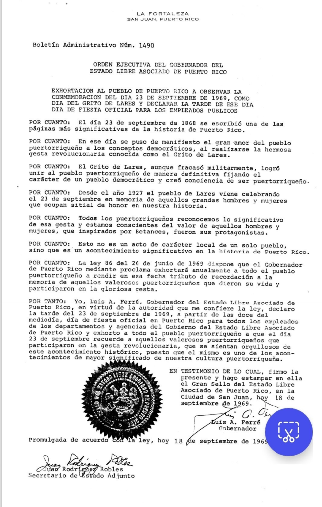 Yo, Luis A. Ferré, Gobernador del Estado Libre Asociado de Puerto Rico, virtud de la autoridad que me confiere la ley, la tarde del 23 de septiembre de 1969, a partir de las doce del mediodía, día de fiesta oficial en Puerto Rico para todos los empleados de los departamentos y agencias del Gobierno del Estado Libre Asociado de Puerto Rico y exhorto a todo el pueblo puertorriqueño a que el día 23 de septiembre recuerde a aquellos valerosos puertorriqueños que participaron en la gesta revolucionaria, que se sientan orgullosos de este acontecimiento histórico, puesto que el mismo es uno de los acontecimientos de mayor significado de nuestra cultura puertorriqueña.
