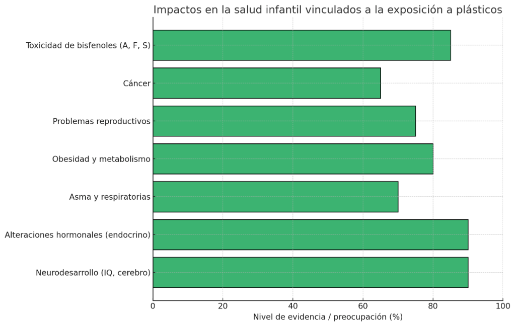 En términos económicos, se estima que en Estados Unidos las enfermedades infantiles atribuibles a la exposición a plásticos generan un costo de 250 mil millones de dólares anuales en atención médica y pérdida de productividad.