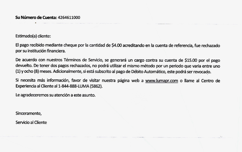 Muchos de nosotros pagamos con cuenta de banco por métodos electrónicos. Se nos envían cartas indicando que el pago fue rechazado por el banco y se nos añade un cargo de $15.00 por la devolución del pago. Si uno paga esa cantidad, recibe otra carta alegando pago rechazado por el banco. El cliente llama a LUMA para cuestionar y ellos insisten que es culpa del banco. Pero, en el banco no aparece ningún cargo. La única opción que da LUMA es ir a pagar en la oficina regional. Lo cual representa un largo viaje para esperar varias horas su turno. Algo inhumano esa exigencia, tratándose de ancianos con muchas limitaciones físicas y condiciones del corazón, entre otras. Aparte de un enorme gasto para los afectados, por lo general con pensiones muy bajas.