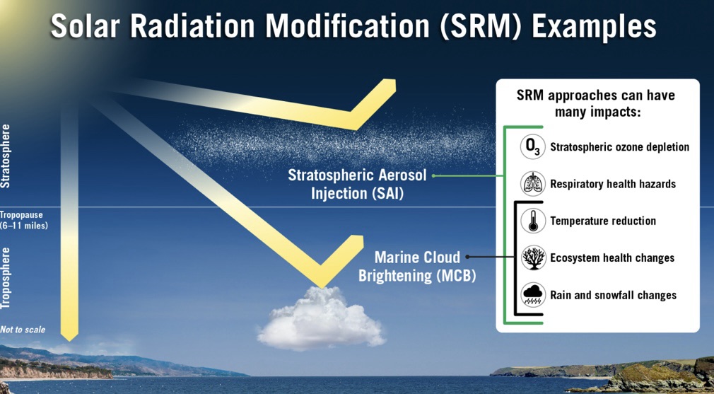 Un subconjunto de actividades de geoingeniería busca enfriar la Tierra modificando intencionalmente la cantidad de luz solar que llega a la superficie terrestre. Estas actividades se conocen como Geoingeniería Solar o Modificación de la Radiación Solar (MRS). La mayoría de las técnicas propuestas de modificación de la radiación solar implican añadir material a la atmósfera para aumentar la cantidad de luz solar entrante que se refleja al espacio. Si bien algunos de estos enfoques se encuentran actualmente en estudio, no existe suficiente información para comprender plenamente la viabilidad, los riesgos y los beneficios de cada uno.