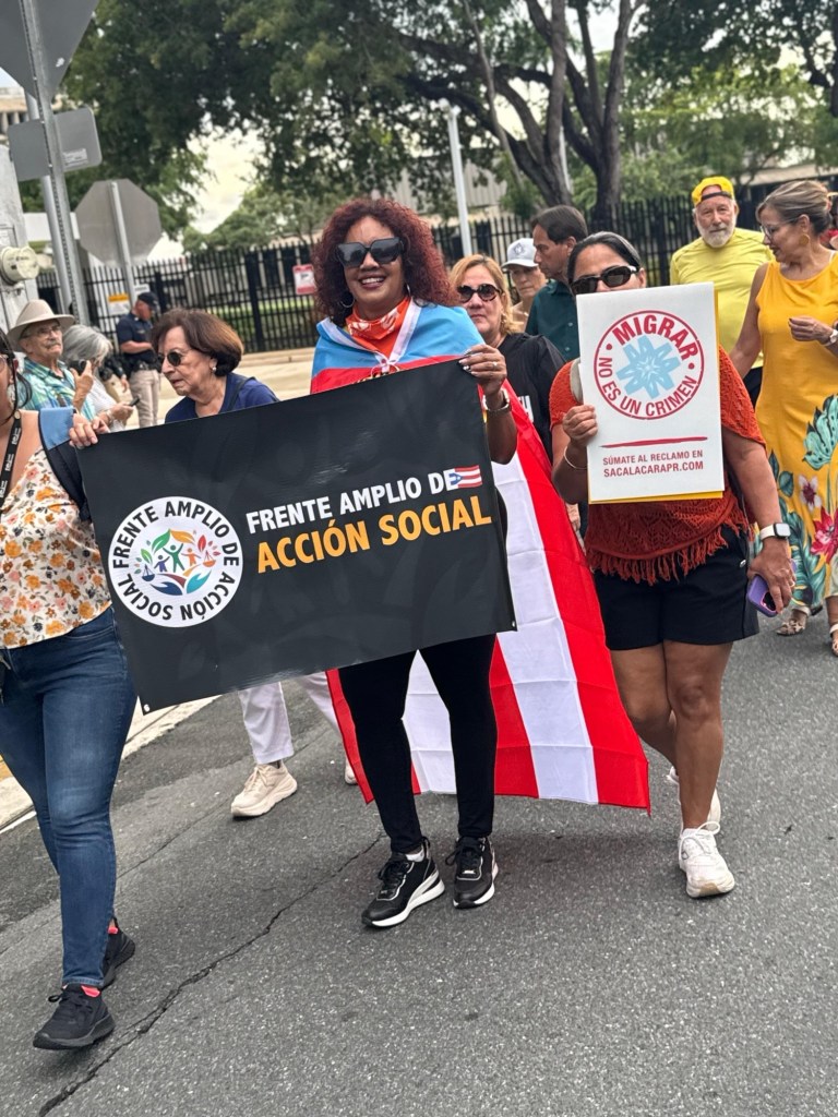 Los manifestantes también reclamaron el derecho a permanecer en las comunidades y en el país, ante medidas que excluyen y limitan el desarrollo y permanencia de cientos de miles de personas puertorriqueñas.