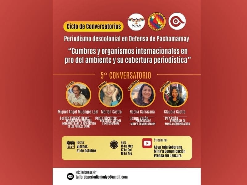 Desde el espacio Abya Yala Soberana, y por iniciativa de Amapola Periodismo Transgresor y Mink’a Comunicación, este viernes 31 de octubre se llevará a cabo el Quinto Conversatorio del Ciclo de Periodismo Descolonial en Defensa de Pachamamay, a las 16 horas (Centroamérica) y 19 horas (Argentina), de forma virtual.