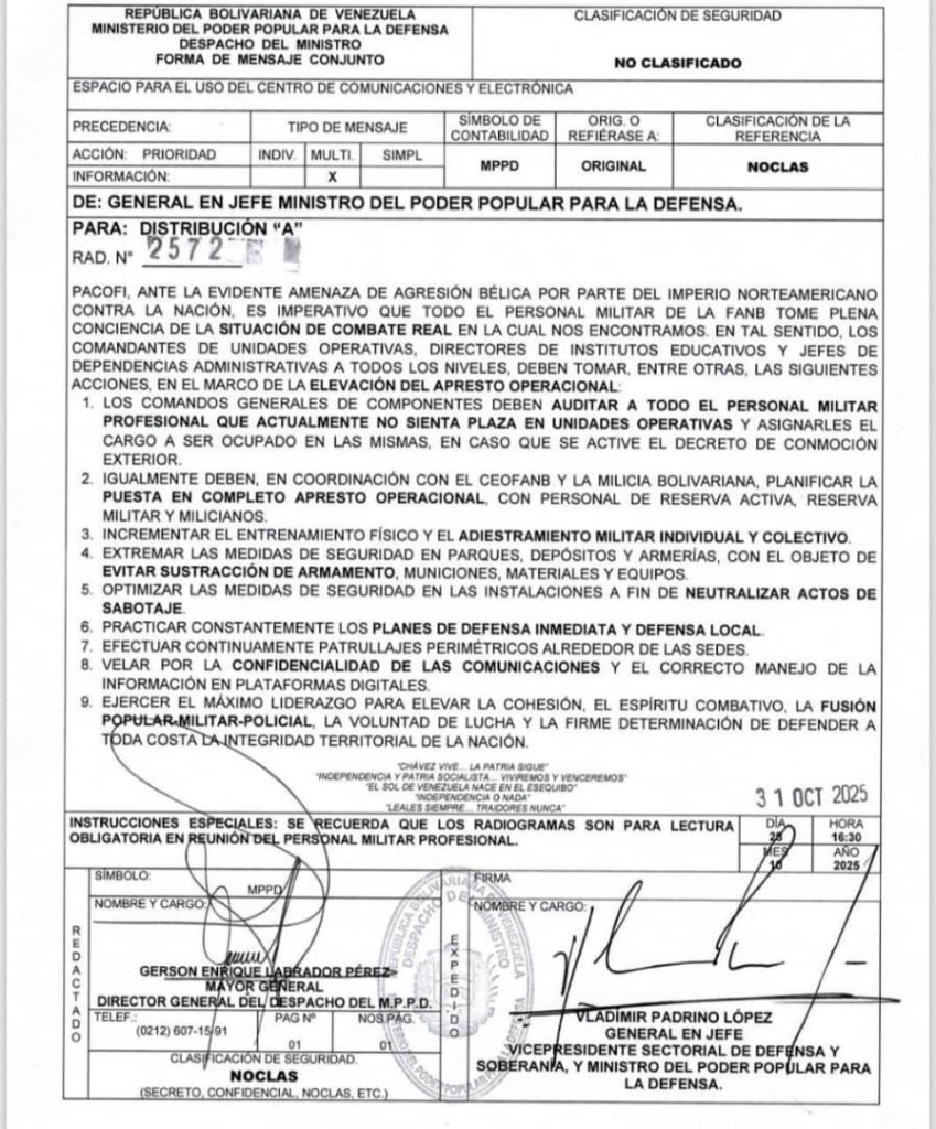 (Caracas, Venezuela, 2 de noviembre de 2025) – Ante la evidente amenaza de agresión bélica por parte del imperio norteamericano contra la Nación, es imperativo que todo el personal militar de la FANB [Fuerza Armada Nacional Bolivariana] tome plena conciencia de la situación de combate real en la cual nos encontramos.