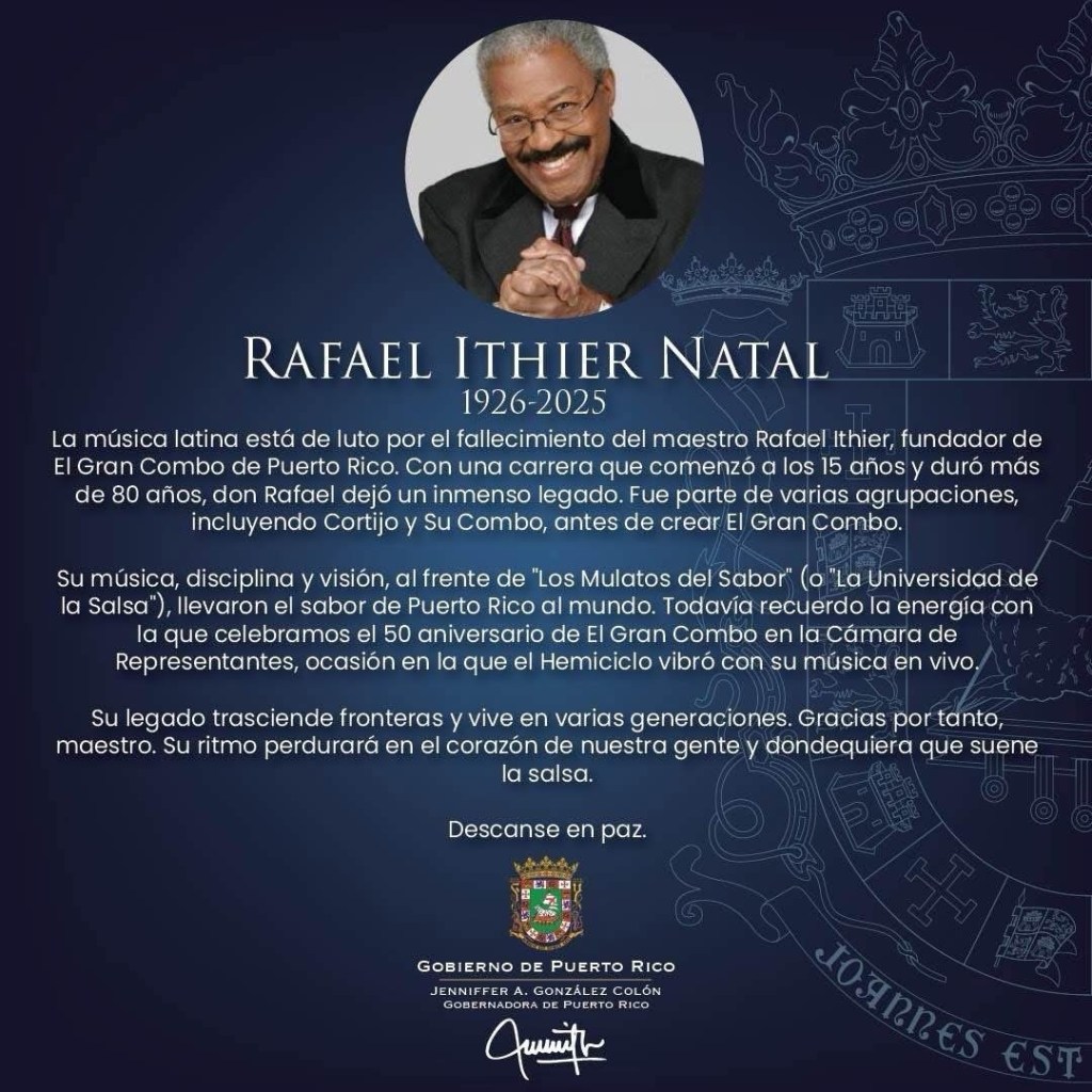 La música latina está de luto por el fallecimiento del maestro Rafael Ithier, fundador de El Gran Combo de Puerto Rico. Con una carrera que comenzó a los 15 años y duró más de 80 años, don Rafael dejó un inmenso legado. Fue parte de varias agrupaciones, incluyendo Cortijo y Su Combo, antes de crear El Gran Combo.