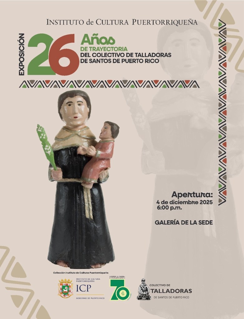 (San Juan, Puerto Rico, 13 de diciembre de 2025) — El Instituto de Cultura Puertorriqueña (ICP) anunció dos exposiciones que celebran la riqueza y diversidad de las tradiciones artesanales en Puerto Rico: 26 años de trayectoria del Colectivo de Talladoras de Santos en Puerto Rico y El mundillo de nuestro tiempo. Ambas exposiciones engalanan la Galería de la Sede del ICP, ubicada en el Viejo San Juan.