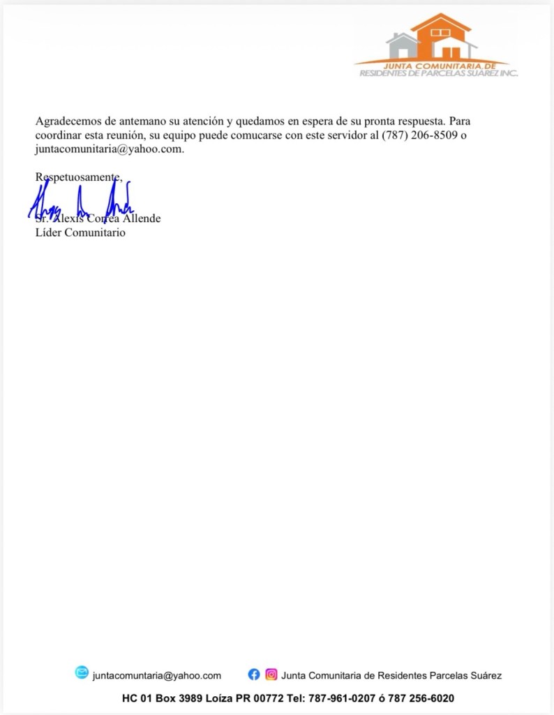 Para coordinar esta reunión, su equipo puede comunicarse con este servidor al (787) 206-8509 o escribir a: juntacomunitaria@yahoo.com.