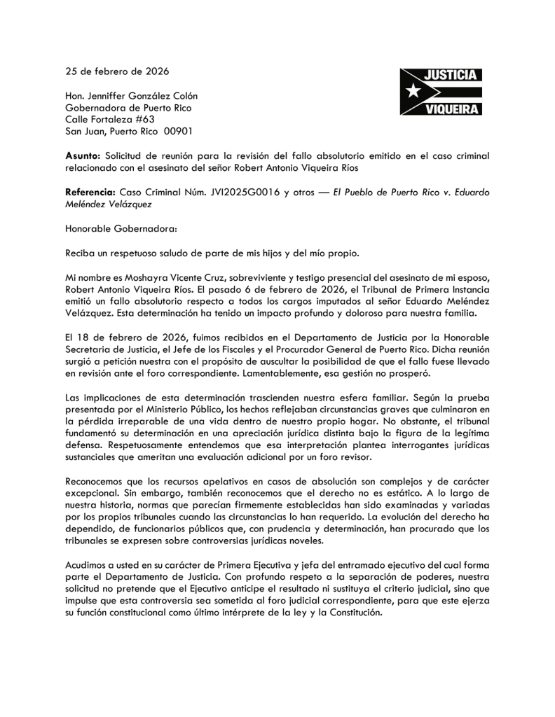 (San Juan, Puerto Rico, 25 de febrero de 2026) – Moshayra Vicente Cruz, junto a sus hijos, acudió esta mañana a La Fortaleza para entregar personalmente una carta dirigida a la Gobernadora de Puerto Rico, Jenniffer González Colón, mediante la cual solicita una reunión oficial para dialogar sobre la posibilidad de revisión del fallo absolutorio emitido en el proceso criminal relacionado con el asesinato de su esposo y padre de sus hijos, el biólogo Robert Antonio Viqueira Ríos.