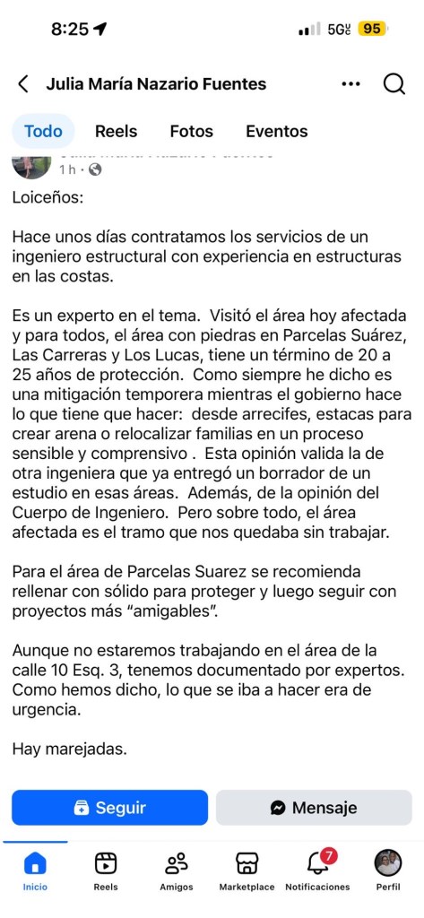 “Hace unos días contratamos los servicios de un ingeniero estructural con experiencia en estructuras en las costas. Es un experto en el tema. Visitó el área hoy afectada y para todos, el área con piedras en Parcelas Suárez, Las Carreras y Los Lucas, tiene un término de 20 a 25 años de protección”.
