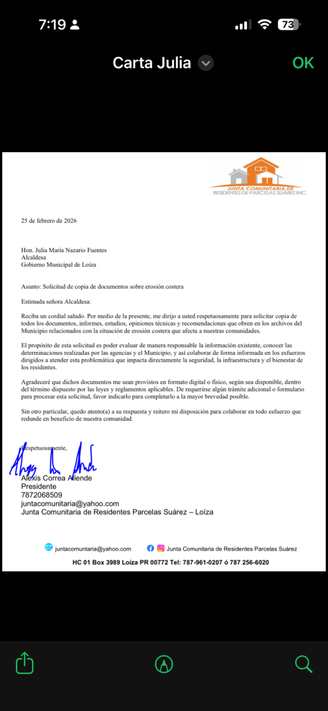 “Por medio de la presente, me dirijo a usted respetuosamente para solicitar copia de todos los documentos, informes, estudios, opiniones técnicas y recomendaciones que obren en los archivos del Municipio relacionados con la situación de erosión costera que afecta a nuestras comunidades.