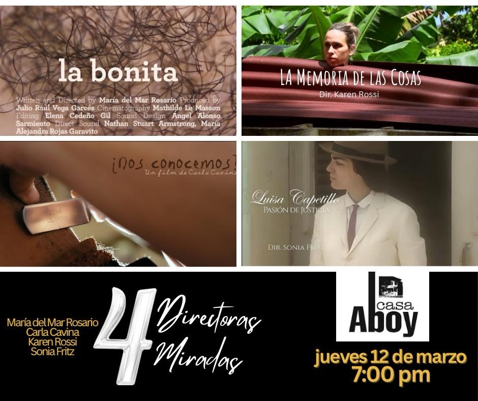(11 de marzo, de 2026, San Juan, Puerto Rico) – Este jueves 12 de marzo, a las 7 PM en la Casa Aboy en Miramar, se presentará una muestra cinematográfica que reúne trabajos de las realizadoras Karen Rossi, Carla Cavina, María del Mar Rosario y Sonia Fritz.