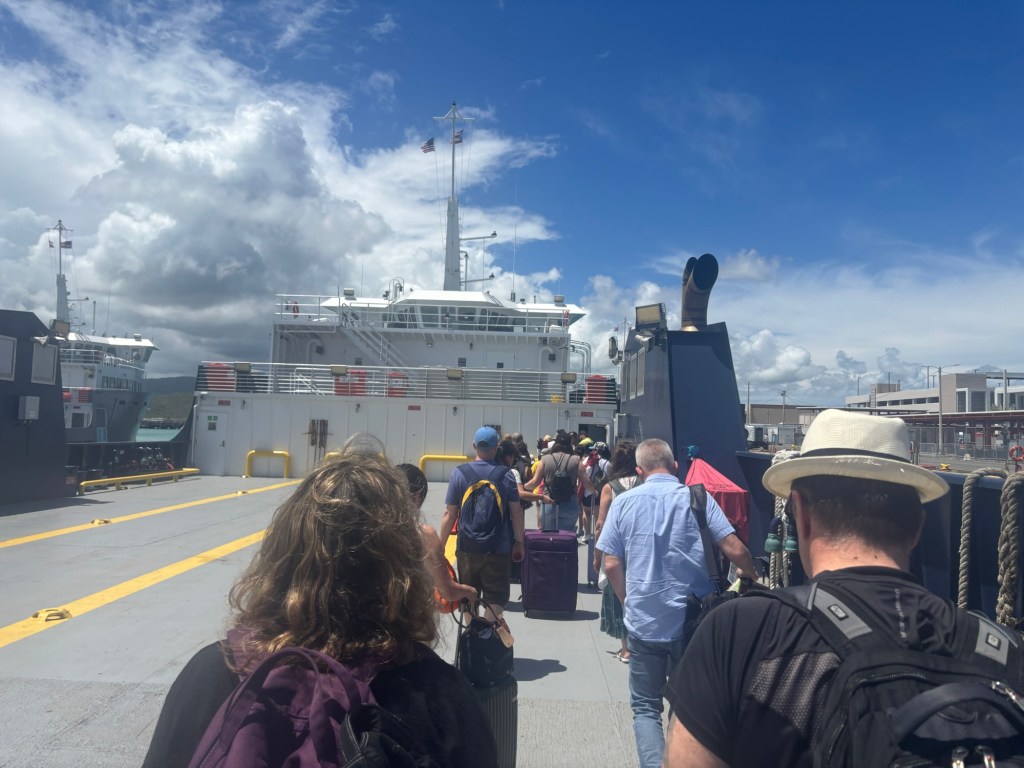 Si cuando llegas al parking resulta que ya se fue la guagua que te transporta al terminal, para no perder la lancha o el ferry tendrás que caminar mochila en espalda alrededor de una milla para llegar a la ventanilla a validar tu boleto.